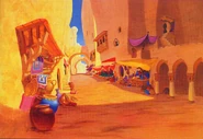 The Agrabah Marketplace (or simply the Bazaar) is the main trading hub of Agrabah, a large stretch of the city where merchants and caravans from all over Agrabah and beyond gather to sale their goods to all residents and travelers.