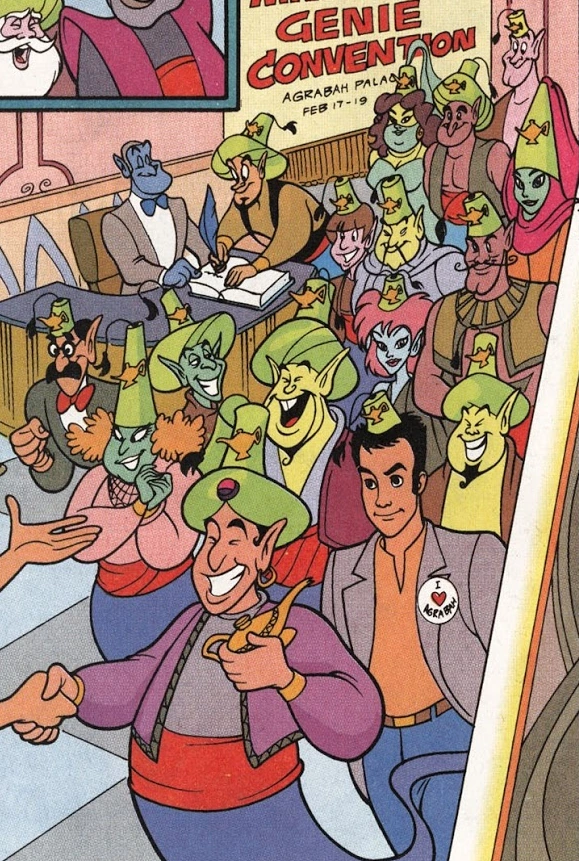 Despite their fall from grace and mass imprisonment, Genies have a very special time of jubilee that they celebrate for three days once every 1,000 years from February 17 to 19, the Genie Convention, a special time where the prisons that bind a genie grow weak and all the imprisoned genies are able to temporarily leave their servitude for just these 3 days once a millennium. This event is controlled by three influential genies referred to as the Genie Convention Committee (or GCC) who choose a chairman to host the convention every thousand years. During this time, genies relax or party as much as they can, however because of their powers genies may end up causing untold damage to the places they choose to hold their conventions at, such as their dancing tearing buildings down, their over-consumption of food ruining local economies such as fishing and even a simple relaxing act such as sunbathing can turn an entire beach into glass. In fact, they may even get so reckless that turning humans into objects or altering the flow of time within the location of a convention can be seen as harmless fun to them. ("Genie Jamboree")
